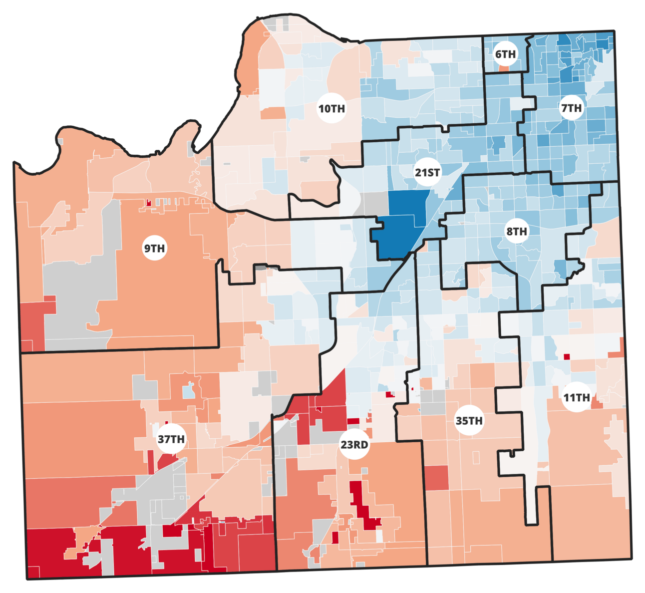 Precinct vote share for Presidential candidate by party. Darker red indicates stronger vote preference for Trump; darker blue indicates stronger preference for Harris. Boundary lines indicate the state Senate district boundaries.