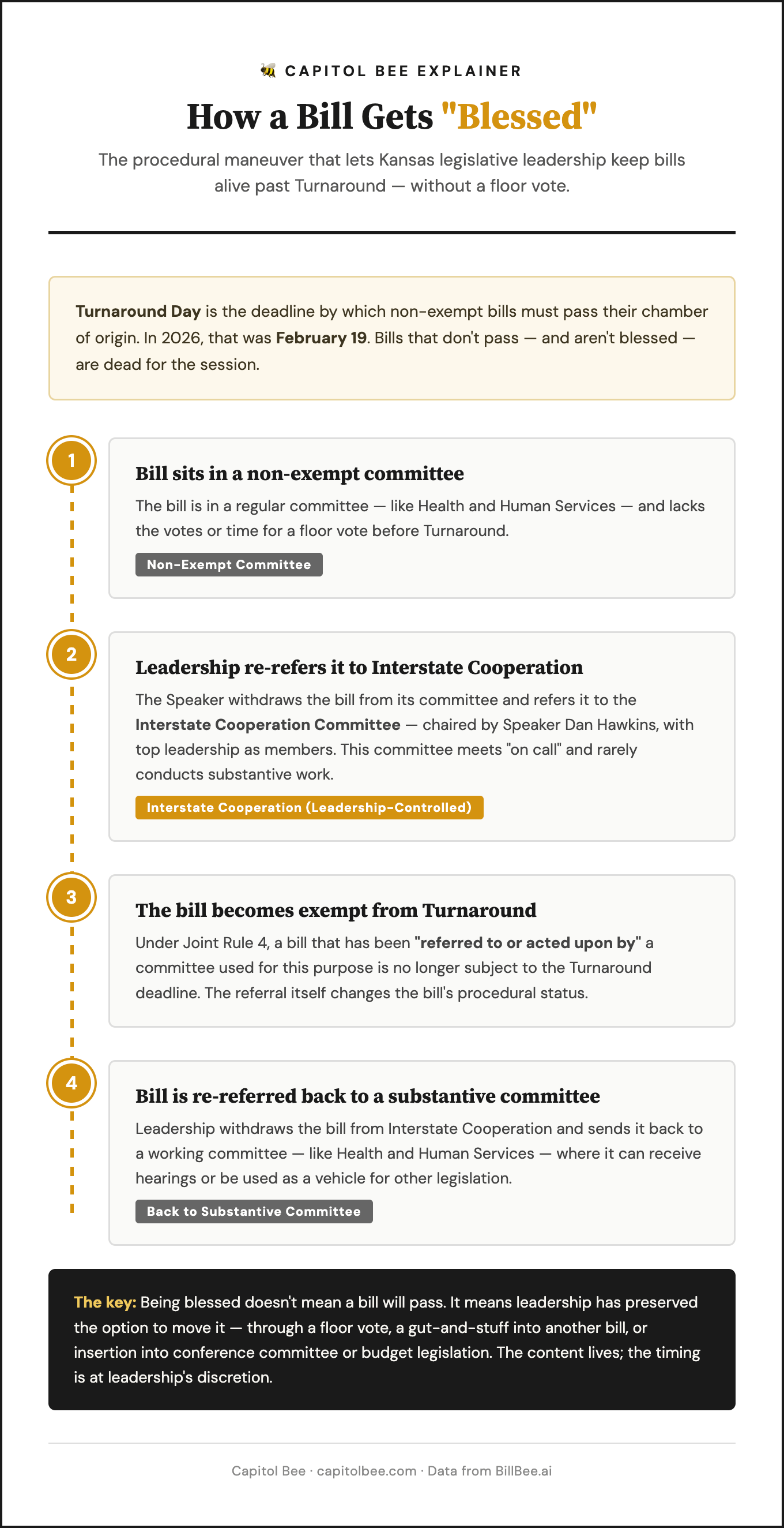 Here's how it works. Under the Kansas Legislature's joint rules, the Turnaround deadline only applies to "non-exempt" bills. A bill becomes exempt if it is "sponsored by, referred to, or acted upon by" an exempt committee—the list includes House and Senate Federal and State Affairs, Senate Ways and Means, Senate Assessment and Taxation, and House Appropriations, Taxation, and Calendar and Printing. But there's a loophole: the House Interstate Cooperation Committee, which is chaired by Speaker Dan Hawkins (R-Wichita) and includes top leadership, can serve as a blessing vehicle. By withdrawing a bill from its original committee and referring it to Interstate Cooperation before the Turnaround deadline, leadership changes the bill's procedural status. Once the bill has been "referred to" this leadership-controlled committee, it is no longer subject to the requirement that it pass its house of origin by Turnaround Day. Leadership can then re-refer it back to a substantive committee, where it sits until they decide what to do with it.