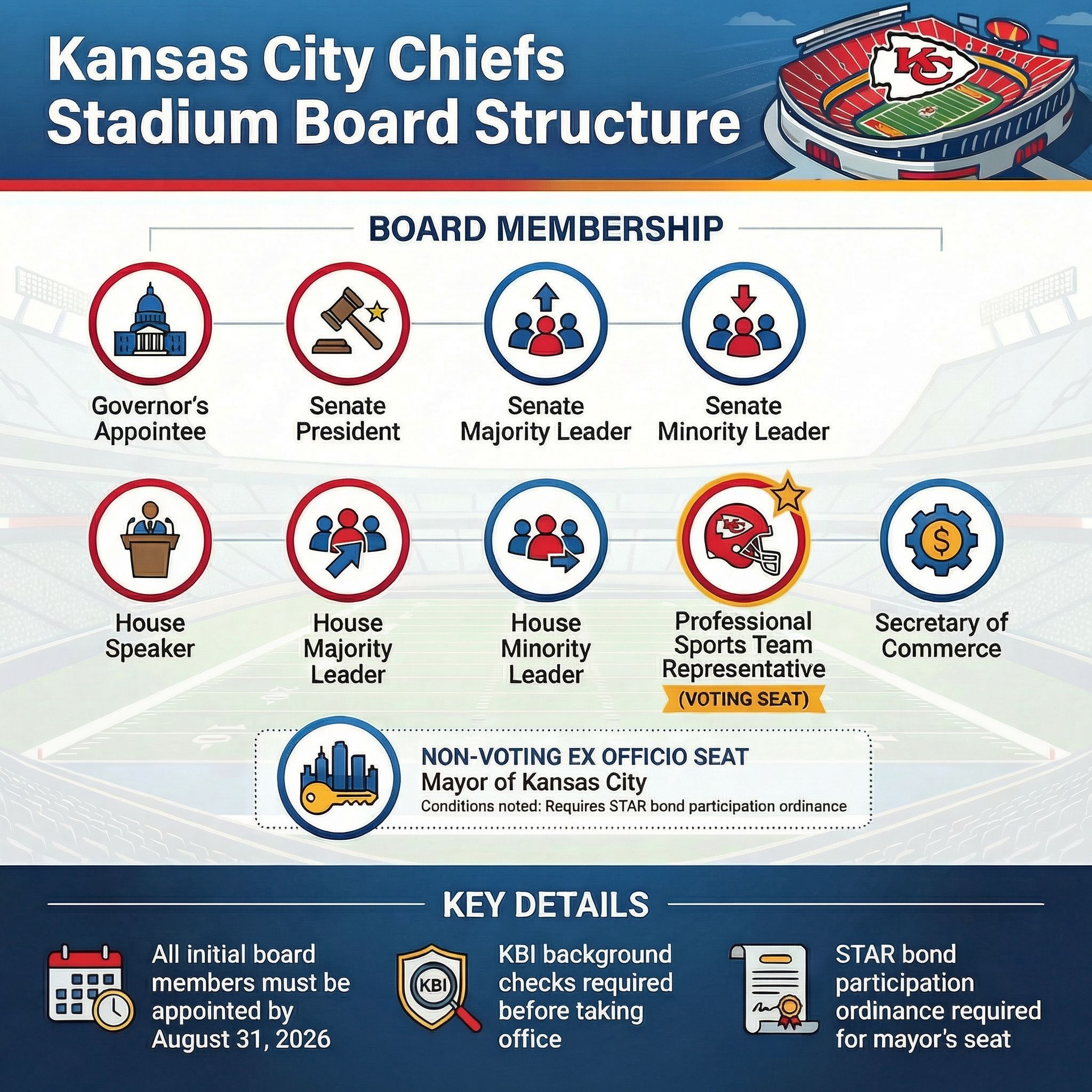 There's also a non-voting ex officio seat for the mayor of any host city, but only if that city has passed a STAR bond participation ordinance, hasn't withdrawn it, and hasn't attached any conditions that conflict with the December 2025 agreement. Given that Olathe has been asked to pledge local sales tax revenue for the HQ and practice facility, the terms for earning a seat at the table are notably one-directional. Participate fully on the state's terms, or don't participate at all.